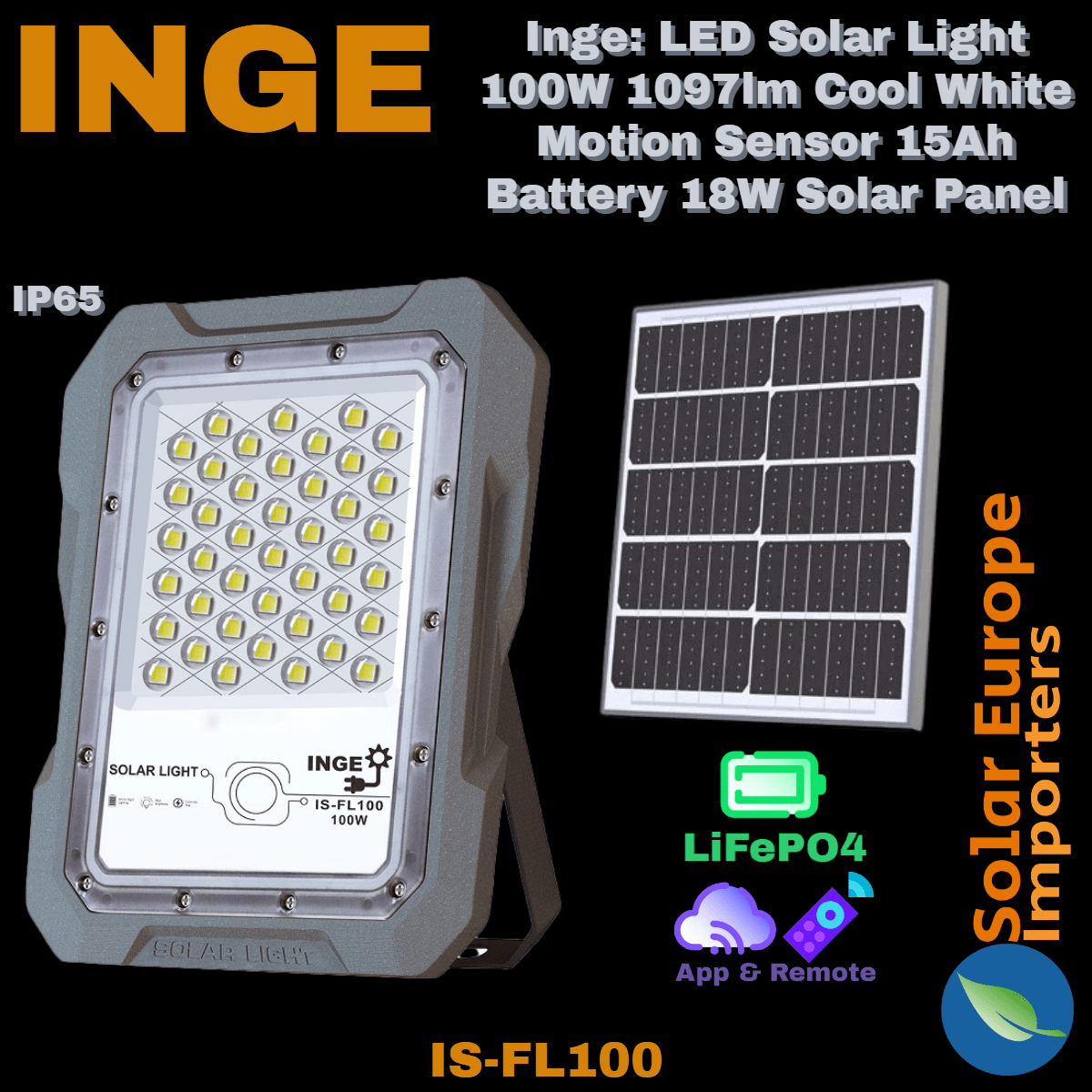 Inge: LED Solar Light 100W 1097lm Cool White Motion Sensor 15Ah Battery 18W Solar Panel (IS-FL100)