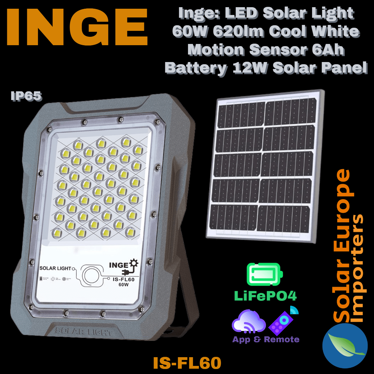 Inge: LED Solar Light 60W 620lm Cool White Motion Sensor 6Ah Battery 12W Solar Panel (IS-FL60)