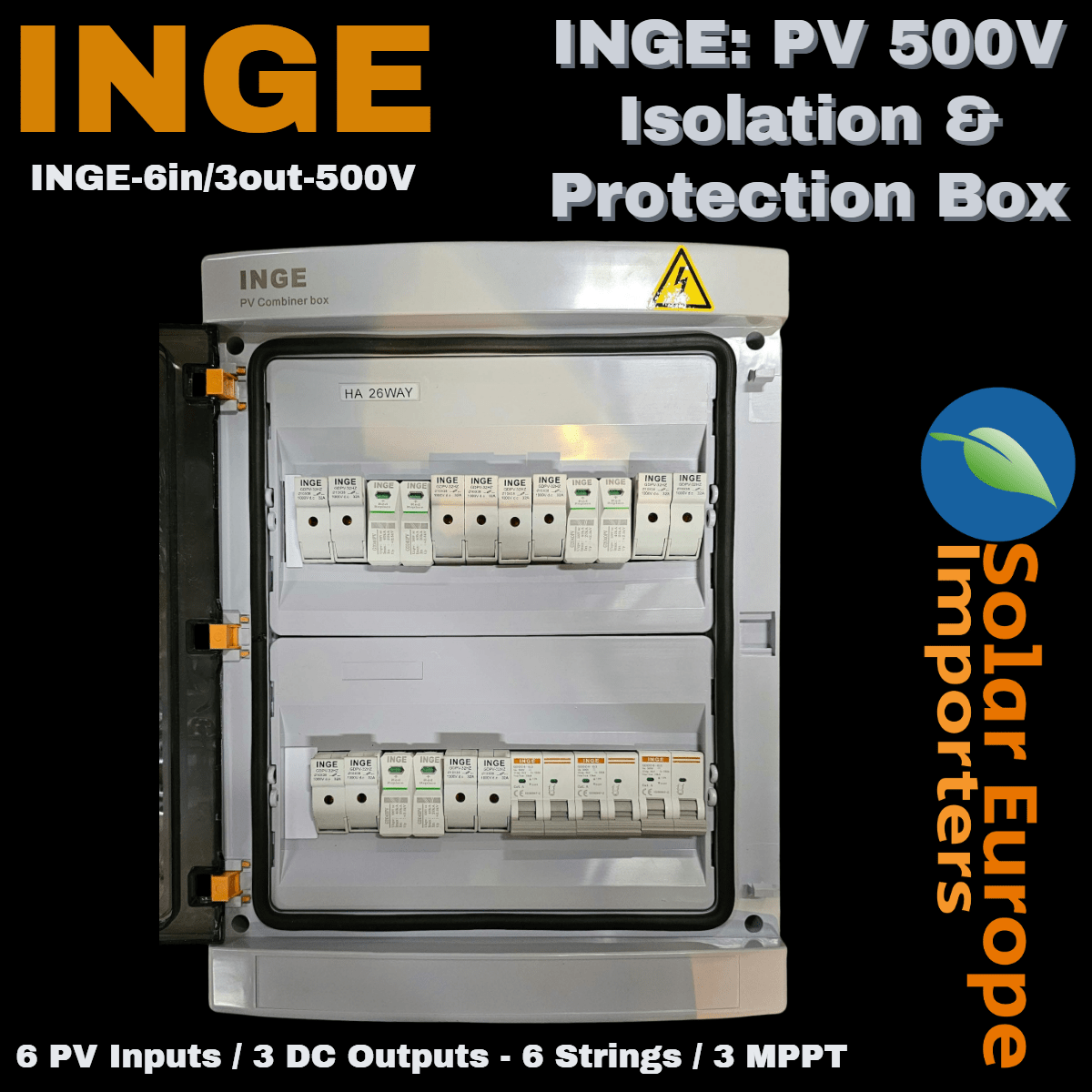 INGE: PV 500V Isolation & Protection Box: 6 PV Inputs / 3 DC Outputs – 6 Strings / 3 MPPT (18 Way Box) (INGE-6in/3out-500V)
