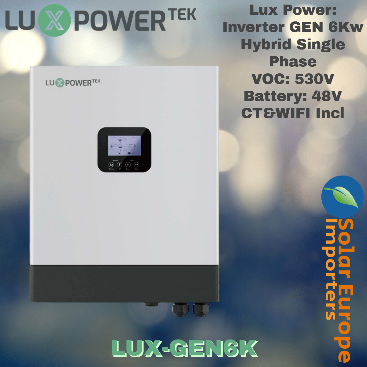 Lux Power: Inverter GEN 6Kw Hybrid Single Phase – VOC: 530V Battery: 48V CT&WIFI Incl (LUX-GEN6K)