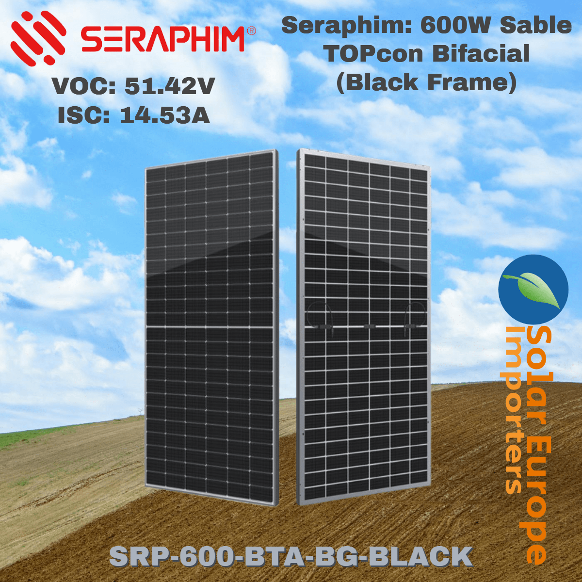 Seraphim: 600W Sable TOPcon Bifacial (Black Frame) – VOC: 51.42V / ISC: 14.53A (SRP-600-BTA-BG-BLACK)